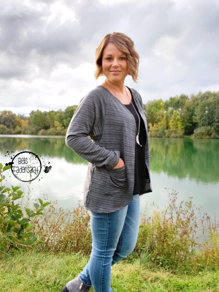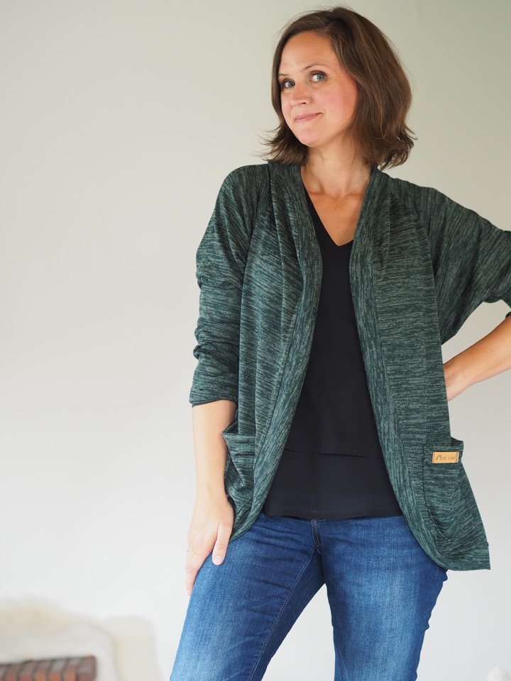Man kann ihn mit zwei verschiedenen Taschen in verschiedenen Größen nähen. Es gibt “eckige” Taschen und abgerundete. Ihr könnt euren Cardigan aber natürlich auch ganz schlicht ohne Taschen nähen.