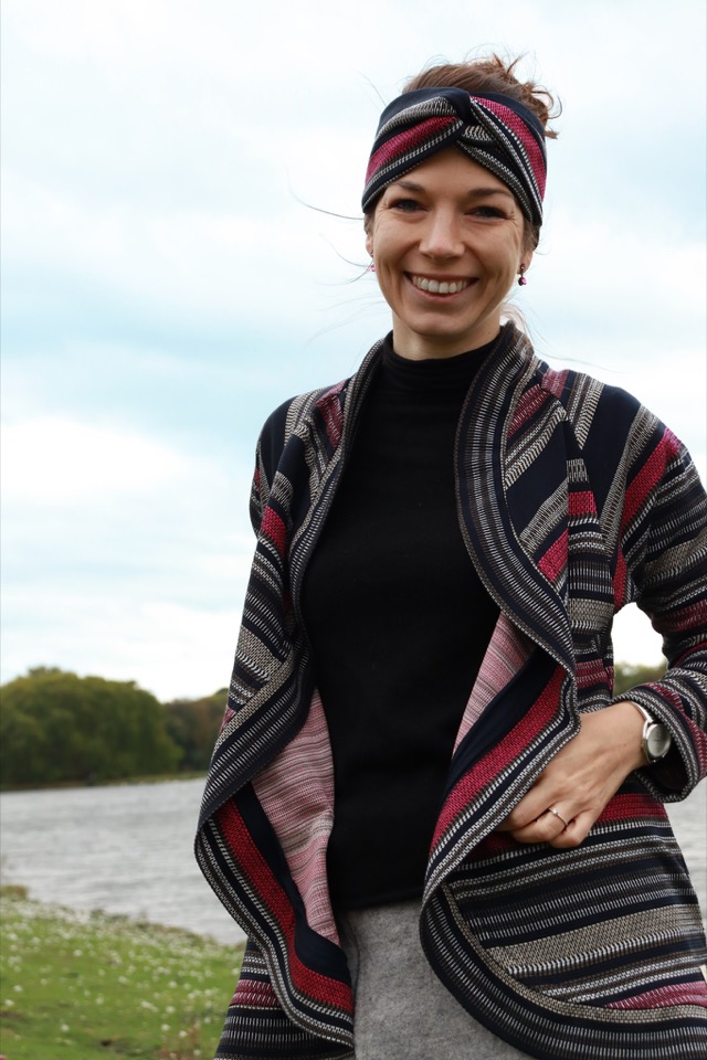 Wenn du es am Hals lieber etwas offener magst, reicht es den Cardigan rundherum zu säumen. Wenn Richtung Hals etwas mehr Stoff sein sollte oder du dich nicht an den Saum traust, gibt es die Möglichst rundherum ein Bündchen anzunähen.