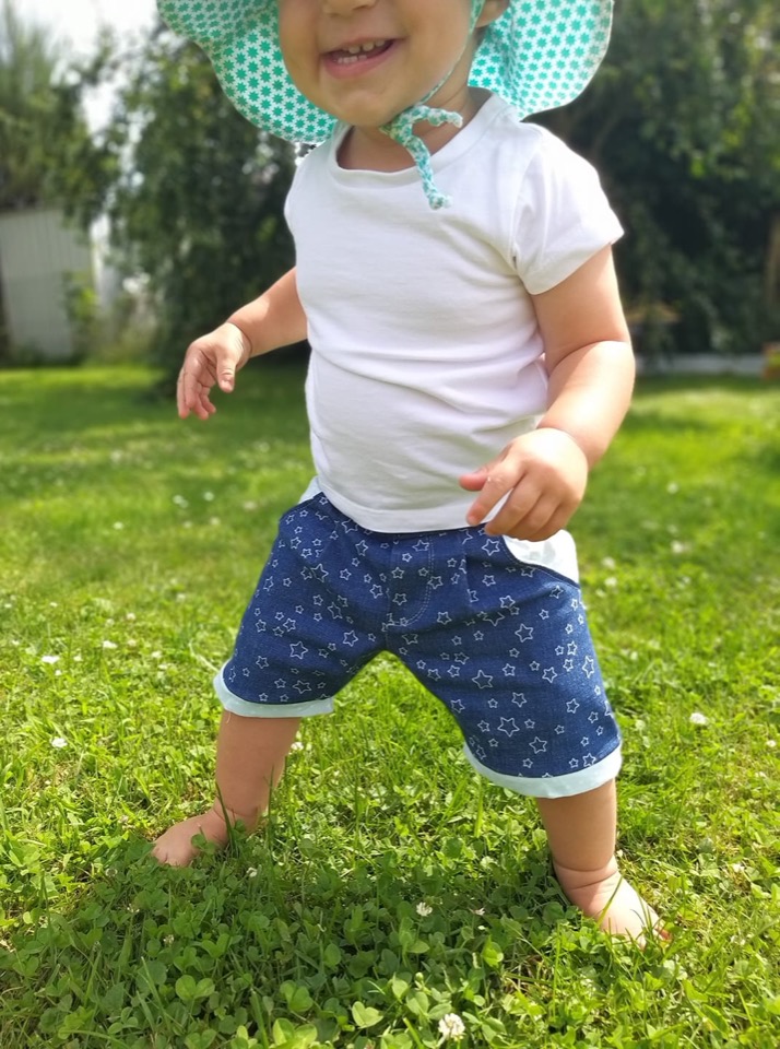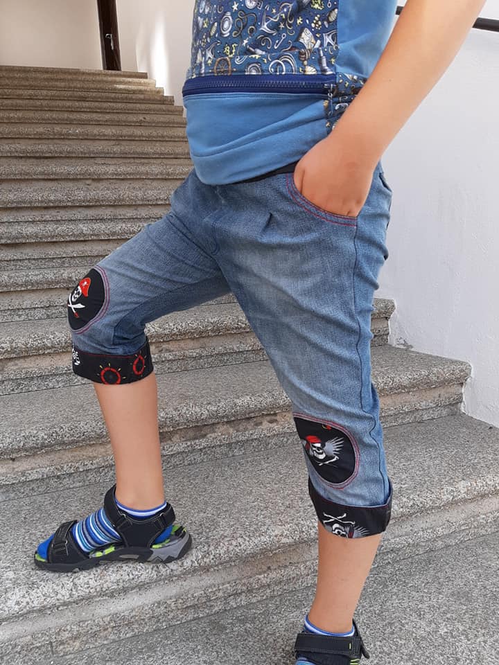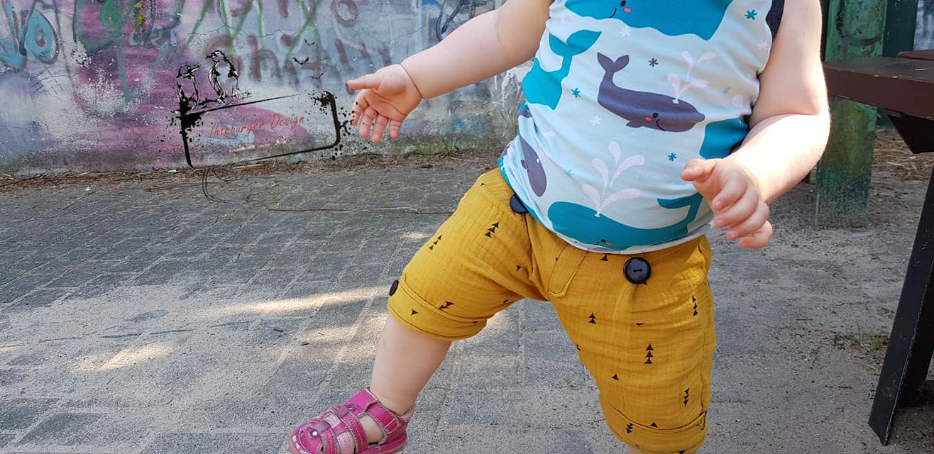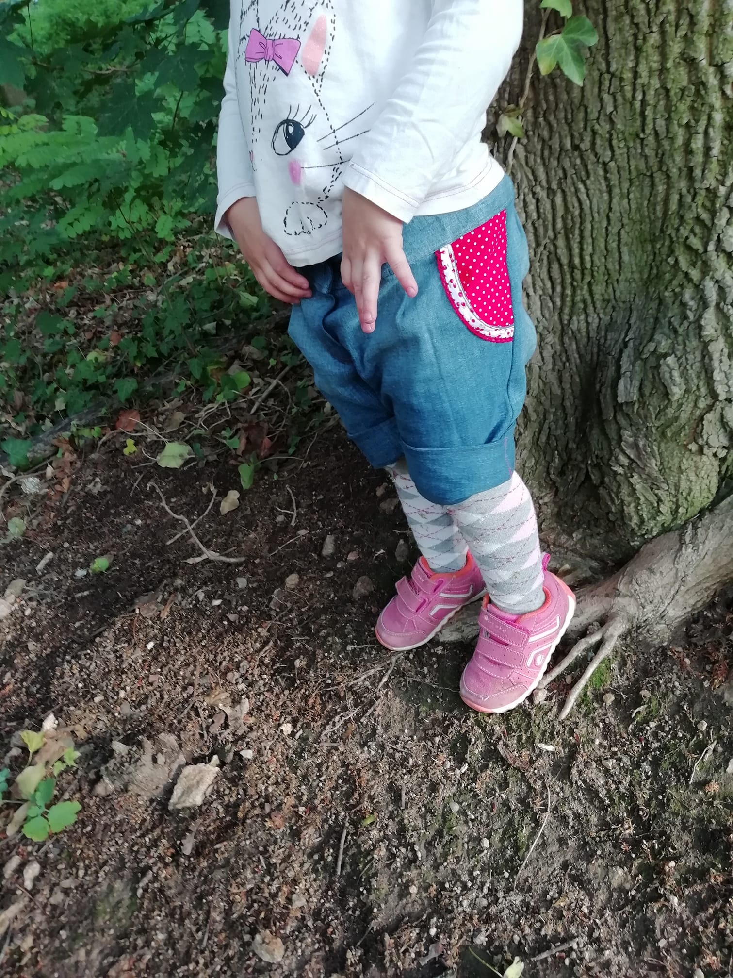 Das besondere an der Hose ist das Knopflochgummiband im Saumbund. Hiermit kann man die Weite sehr gut und sehr einfach an das eigene Kind anpassen.