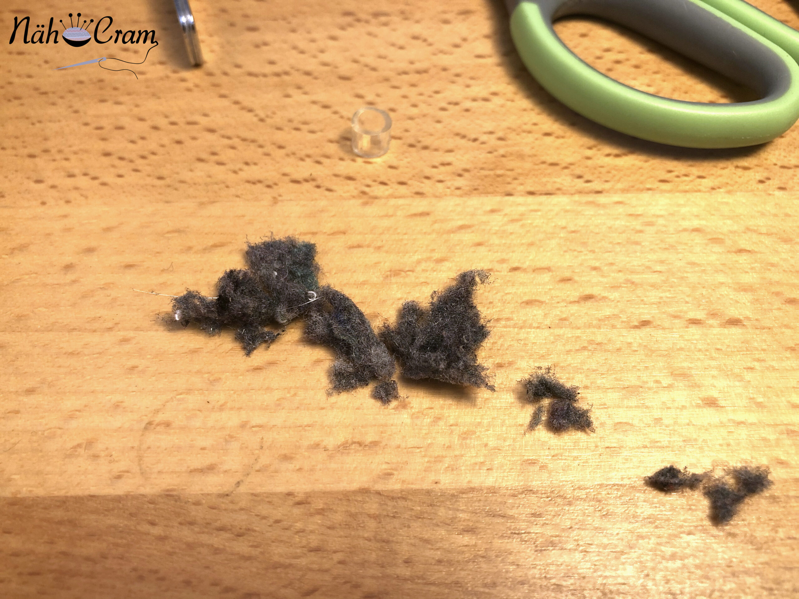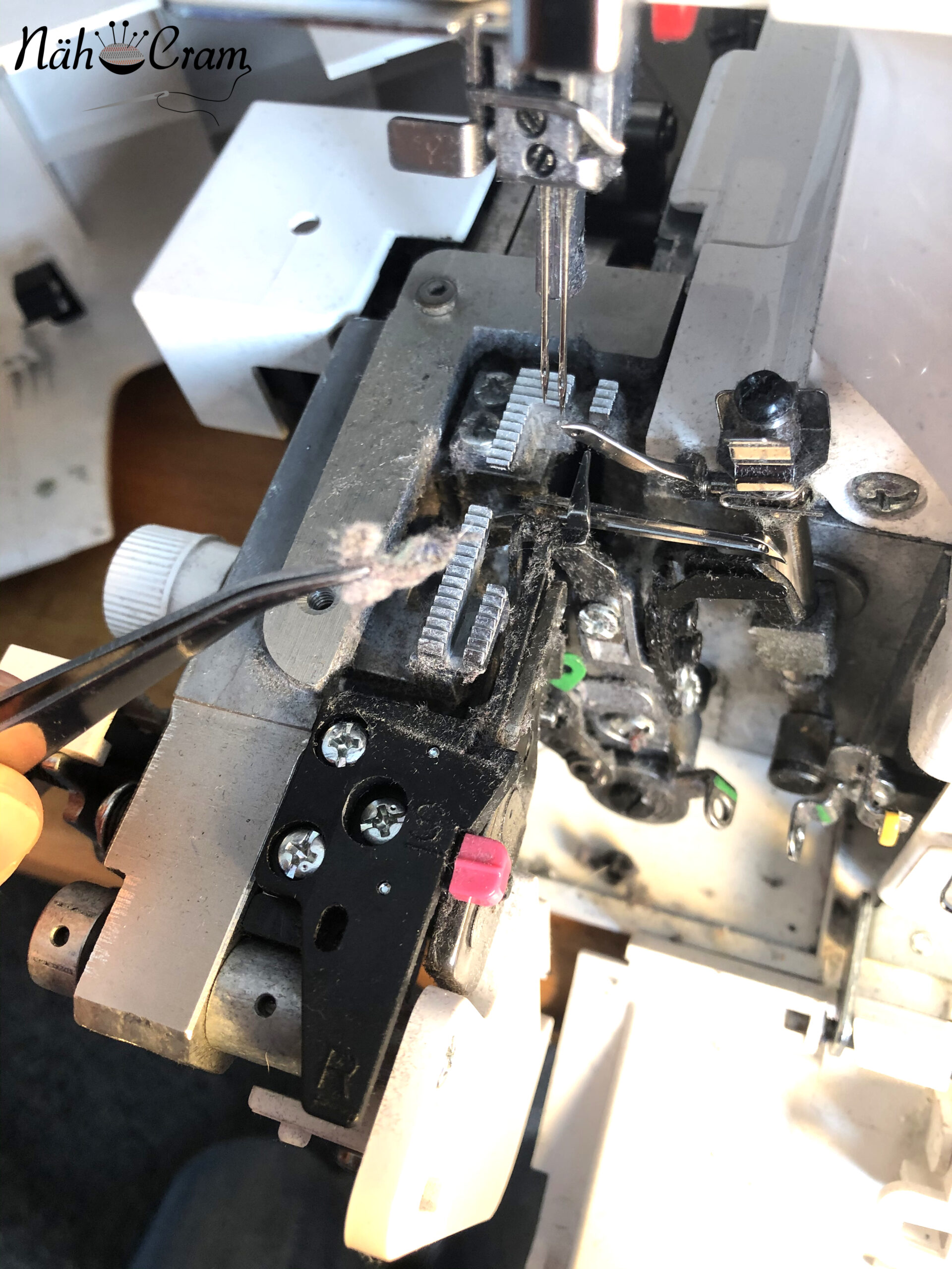 Wenn ihr eure Stichplatte abgeschraubt habt, könnt ihr die groben Fussel erstmal mit einer Pinzette rausholen. Es ist immer wieder erschreckend, wie viel Fusseln und Staub sich ansammeln. Und ich säubere meine Maschinen mindestens jeden Samstag so genau. Je nach Projekt auch öfters.