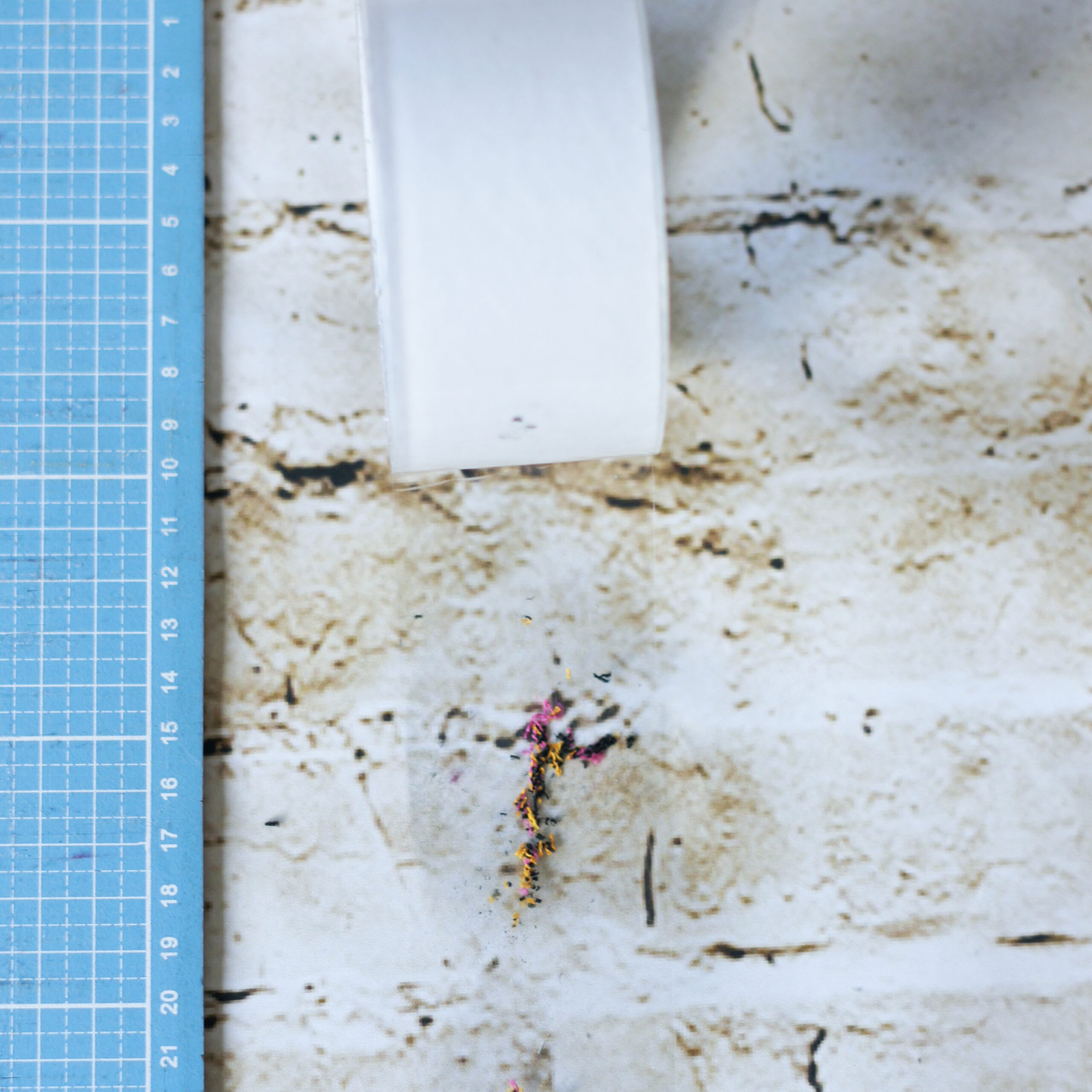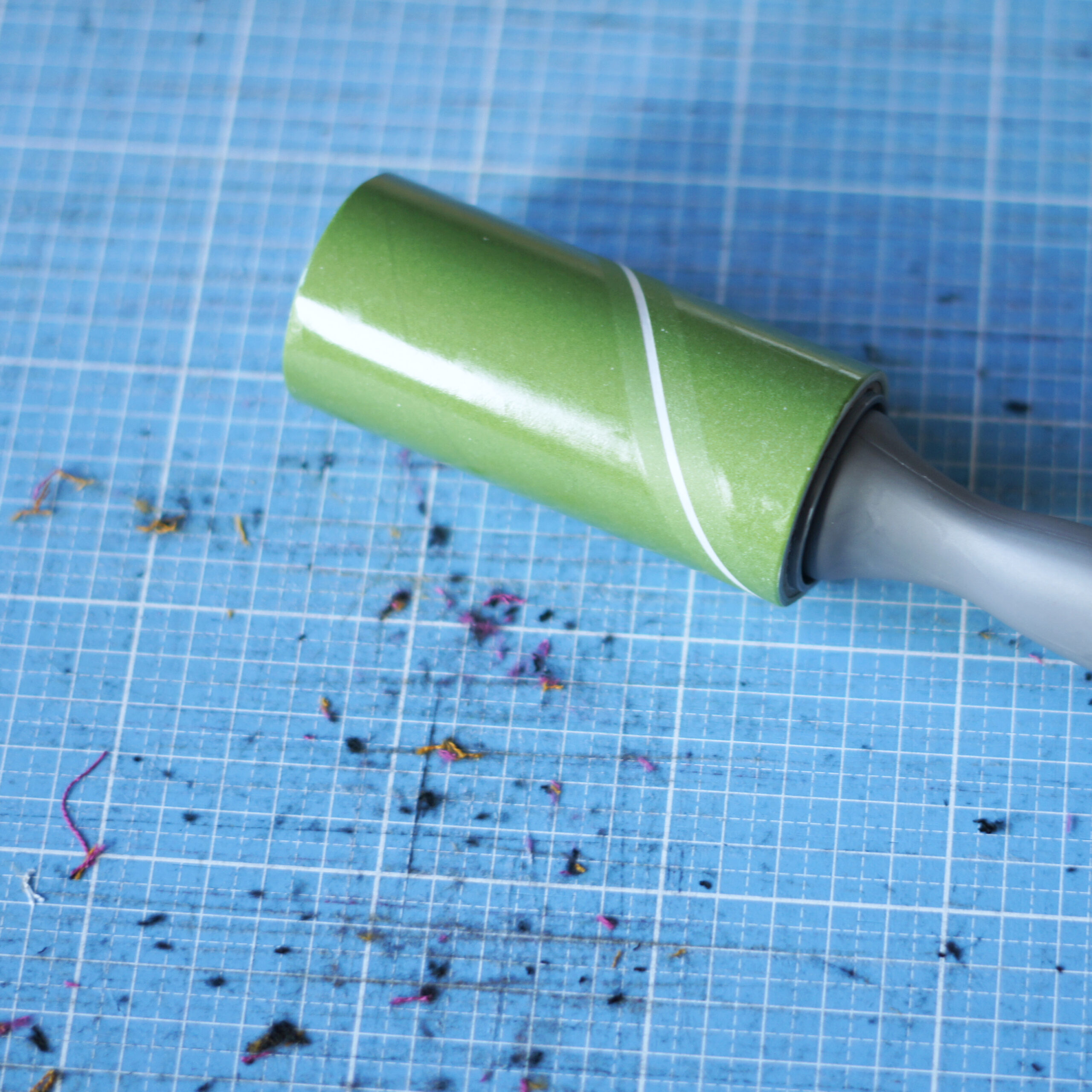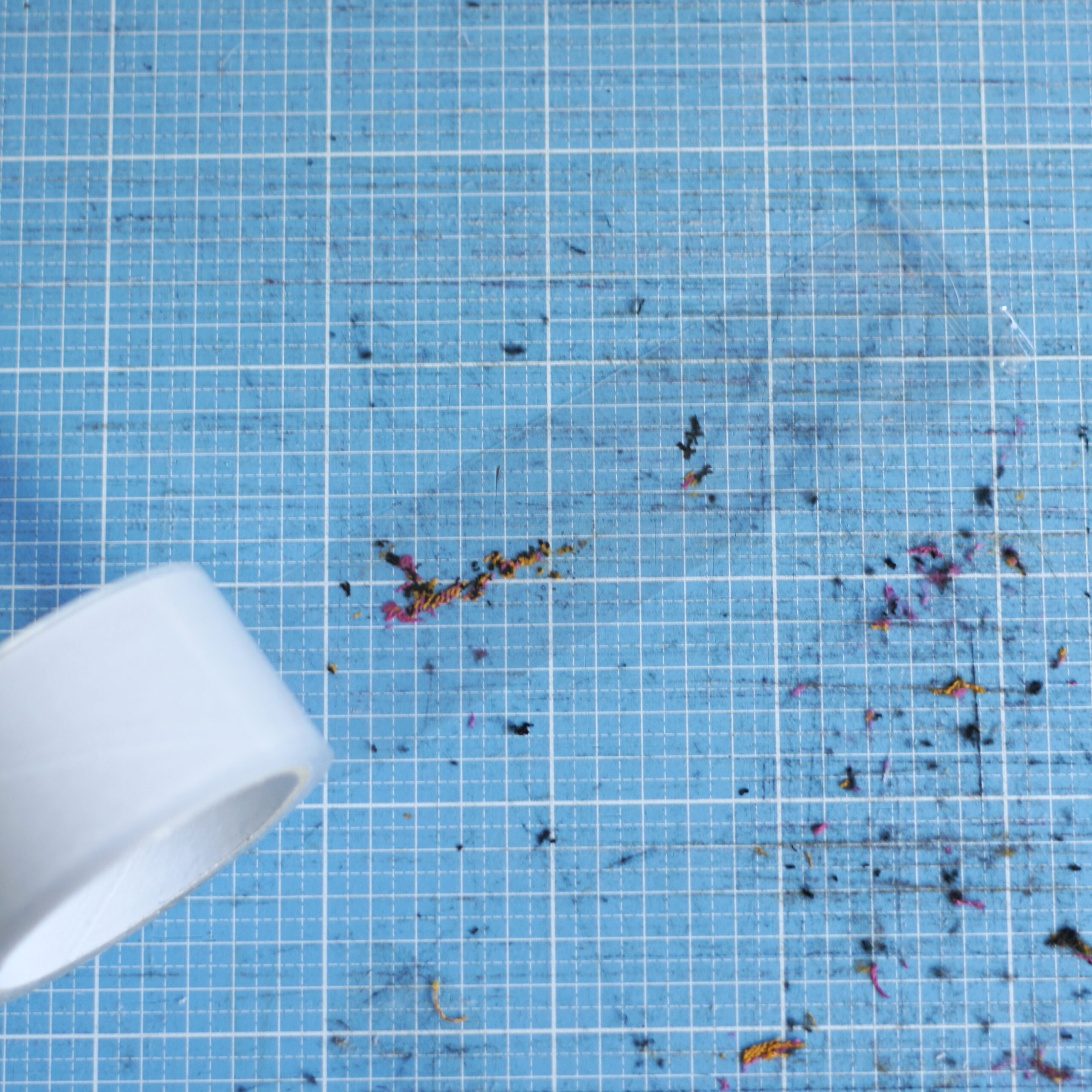 Für eine schnelle Entfernung der Fusseln verwende ich Klebeband. Dieses gut auf die Matte drücken und abziehen. Und schon hast du die groben Fusseln entfernt.