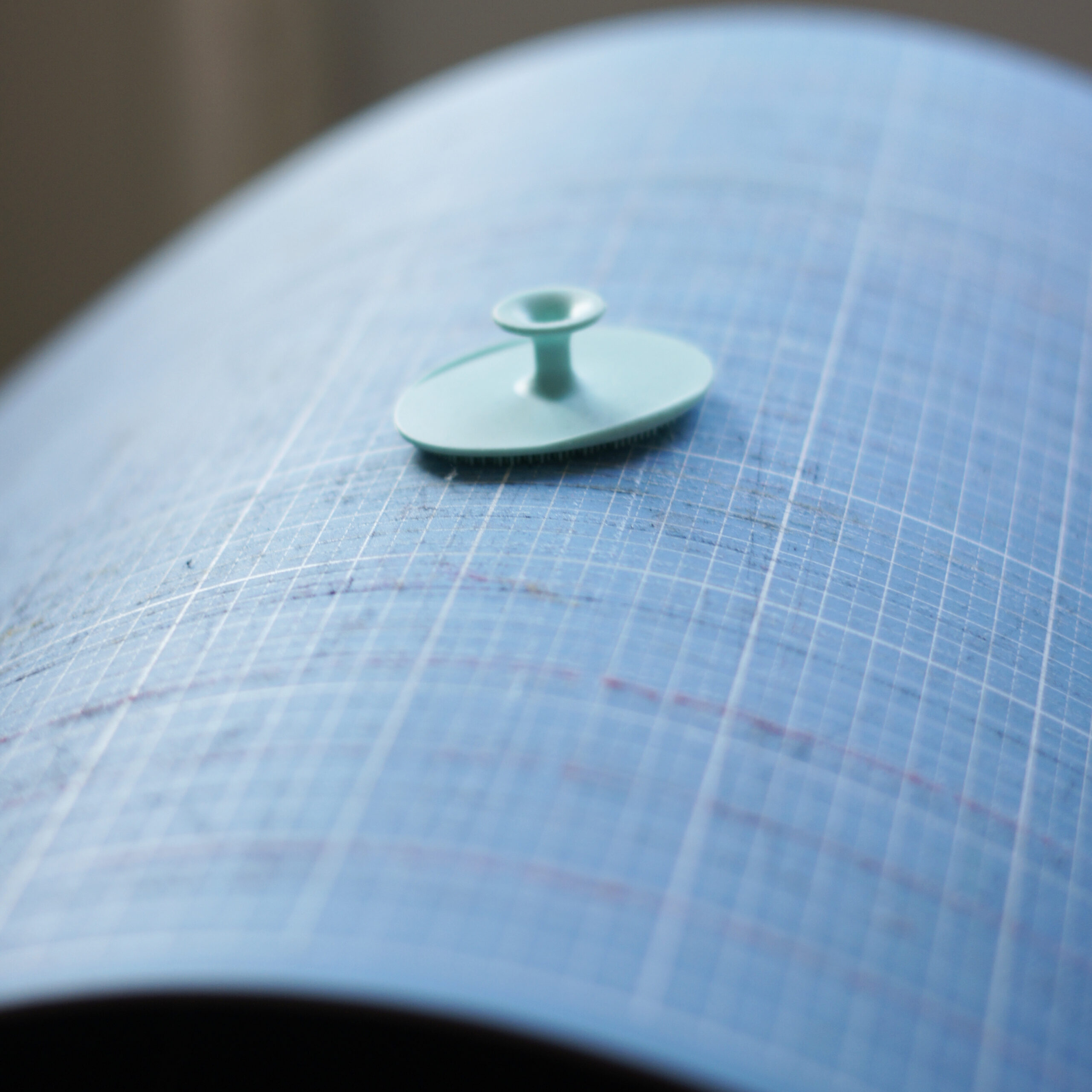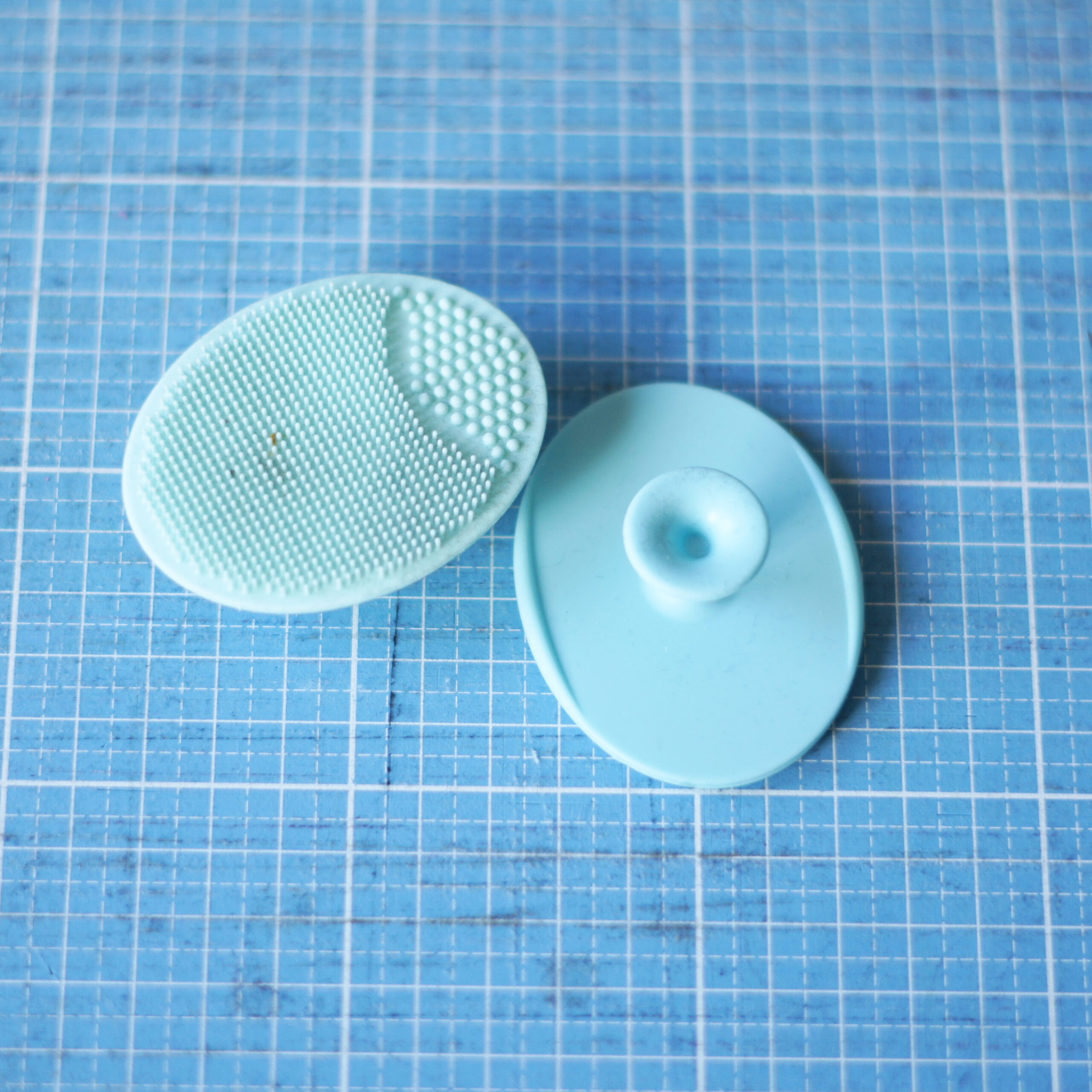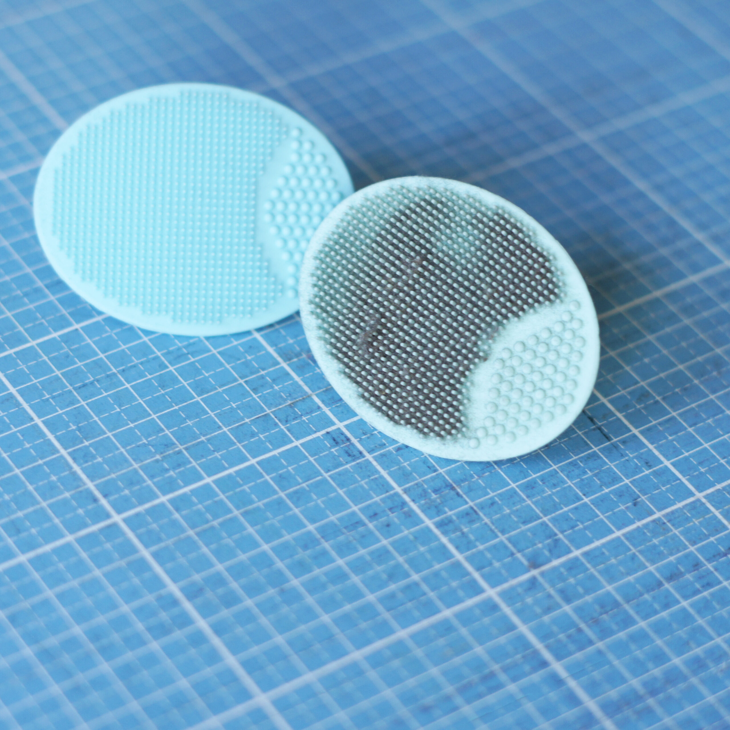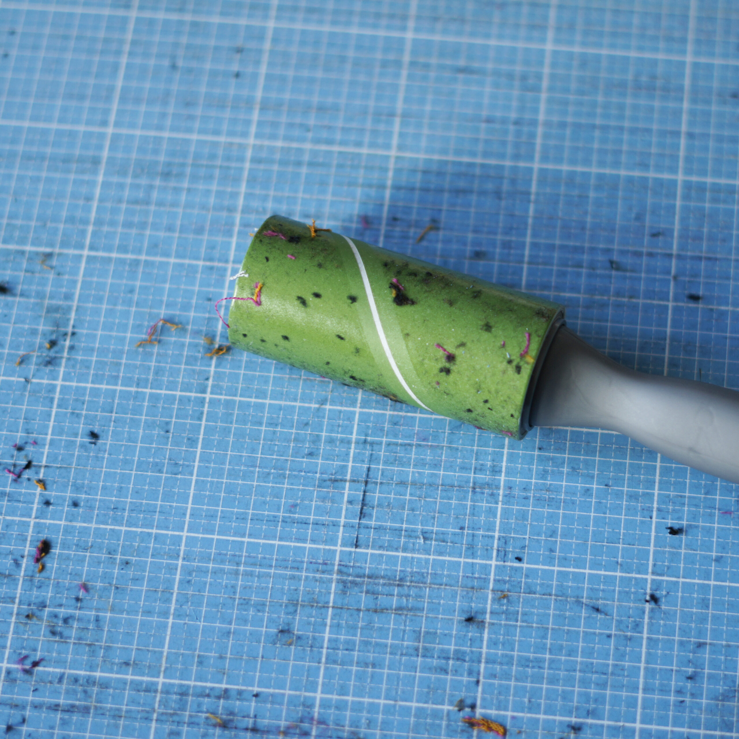 Wenn die Fusseln sehr tief sitzen verwende ich gerne ein Silikon-Pad (zweckentfremdet aus dem Badezimmer). Hier nehme ich die Schneidematte auf mein Schenkel oder die Tischkante (die Matte liegt dann leicht gebogen, so können sich die Schnitte ein wenig öffnen) und gehe in kreisenden Bewegungen mit dem Pad über die Matte.