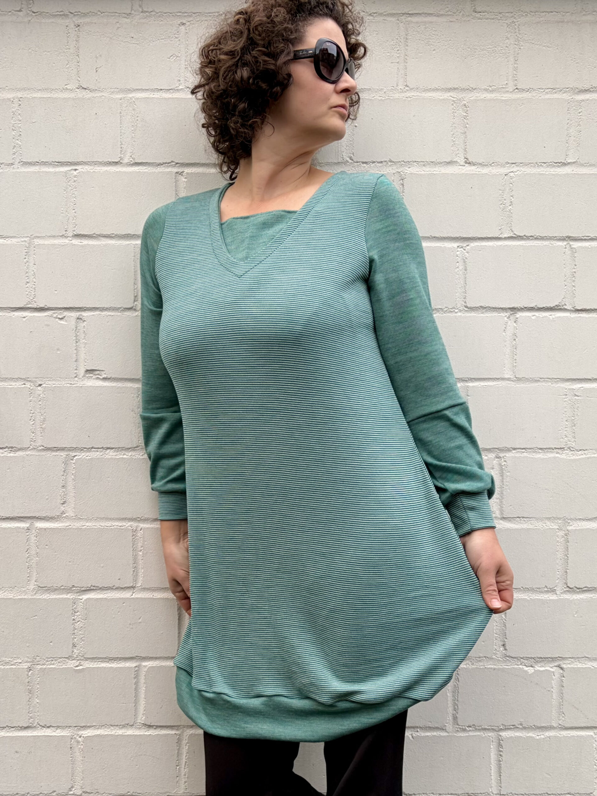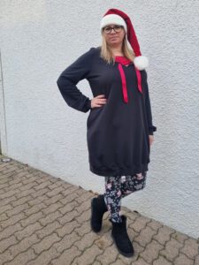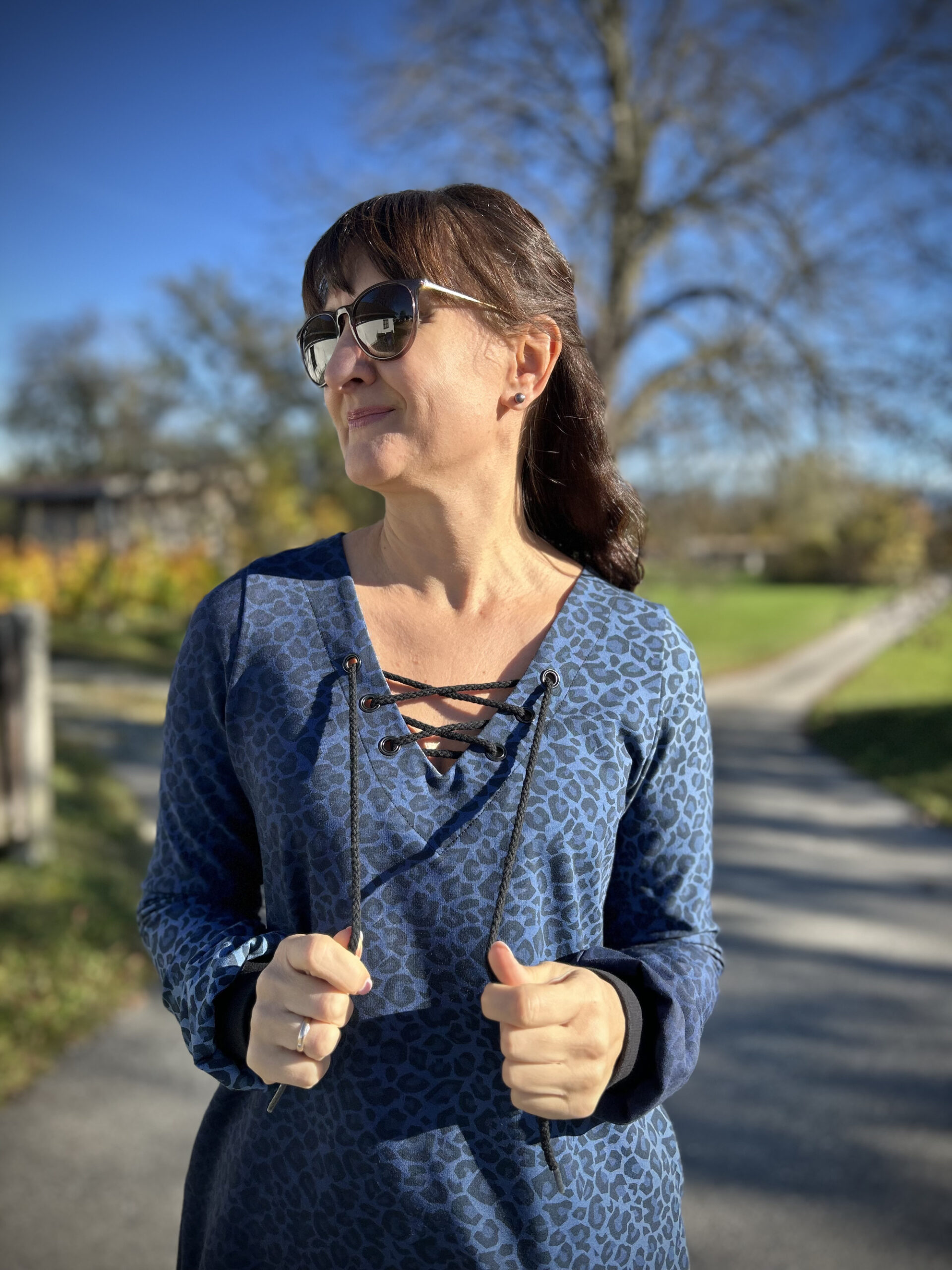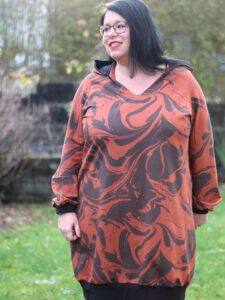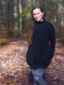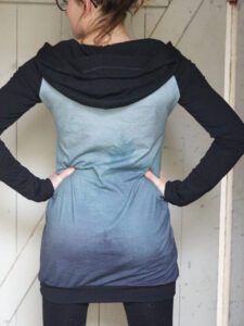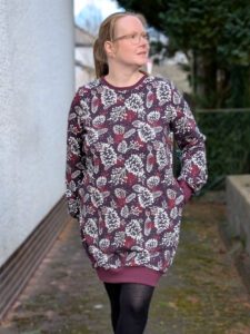 - Optionale Seitentaschen für praktische Nutzung: Das Hoodiekleid kann wahlweise mit praktischen Seitentaschen genäht werden. Diese sind geschickt in die Seitennähte eingearbeitet und können bei Bedarf von außen abgesteppt werden.